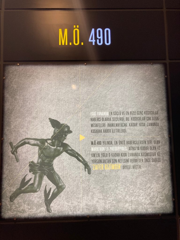 Son not olarak Marathon’lu Pheidippides’in hikayesine değineyim ve noktalayayım: ‘Maraton’ kelimesi; 42K koşusunun diğer adı. Yani 15K, 10K koşuları maraton değil; 21K yarı maraton ; burada ‘K’ kilometre anlamına geliyor. Peki, maratonlar neden 42K koşuluyor: Eski yunanda en güçlü ve en hızlı koşucular haberci olarak seçilirmiş, bu koşucular çok uzun mesafeleri inanılmayacak kadar kısa zamanda koşarak haber iletirlermiş. M.Ö 490 yılında en ünlü habercilerden biri Marathon’lu Pheidippides, Atinaya kadar 42KM’lik yolu o kadar kısa zamanda koşmuş ki , yorgunluktan son nefesini vermeden önce sadece, “Zafer bizimdir!” diyebilmiş.